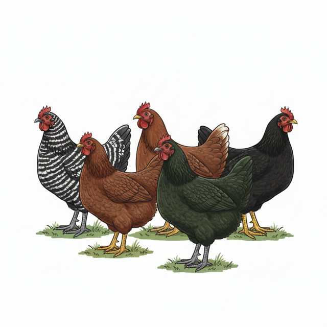 Chickens (Plymouth Rock, Rhode Island Red, Black Sex-Linked, Silkie, Green Olive Egger)